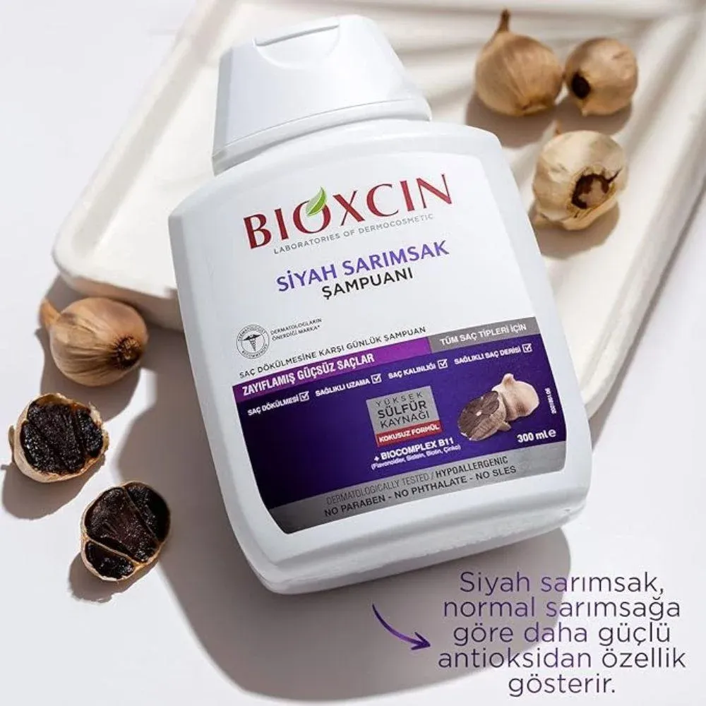 شامپو ضد ریزش سیر سیاه بیوکسین (BIOXCIN)، 300 میل از ریزش موها جلوگیری نموده و تارهای ریشه ضعیف انواع مو را تقویت میبخشد. به لطف وجود سیر سیاه در این شامپو از ریزش موها جلوگیری خواهد شد. همچنین موهای آسیب دیده ترمیم شده و بسیار درخشان خواهند شد. آنتی اکسیدان های سیر سیاه نسبت به سیر معمولی بیشتر است و سبب محافظت از موها و پوست سر میشود. سیر سیاه حاوی بیوکمپلکس B11 میباشد که قدرت شگفت انگیزی در مقابله با ریزش مو دارد. سیر سیاه سرشار از مواد غنی فعال بوده و اثرات متعدد مراقبت کامل از مو، حجم، نشاط و درخشش مو میشود.