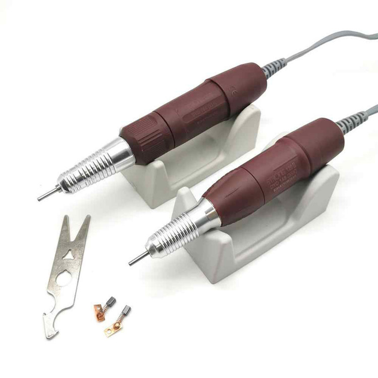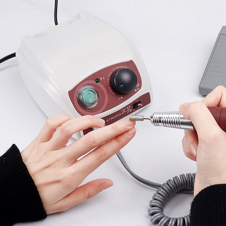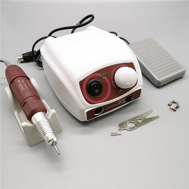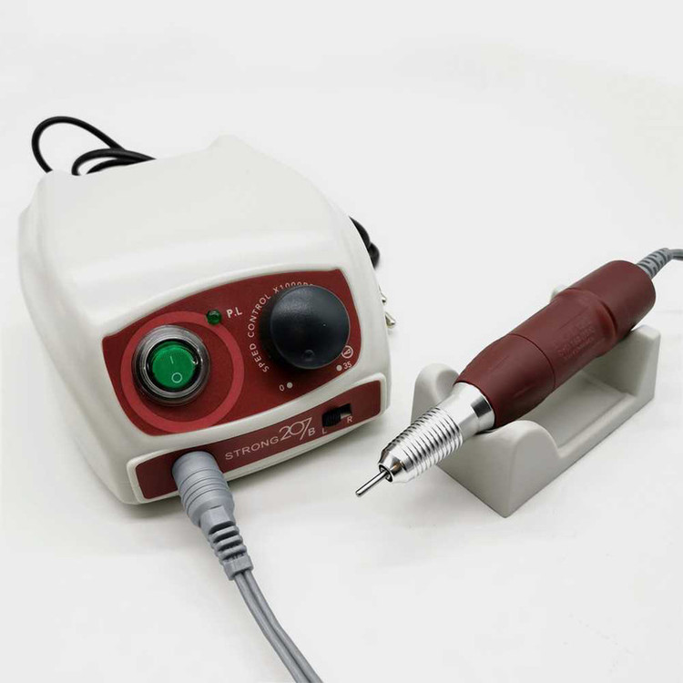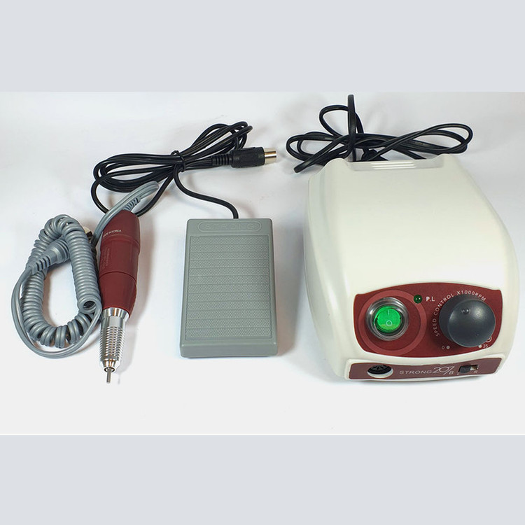 سوهان برقی 207 ساخت کمپانی نام آشنای استرانگ در کشور کره جنوبی می باشد، این دستگاه از محبوبیت بالایی نزد هنرمندان ناخن بهره میبرد. دور موتور این دستگاه 30000 دور می باشد که متاسفانه برخی از همکاران این دستگاه را به عنوان 35000 دور به فروش می رسانند. توجه داشته باشید که در هنگام انتخاب این دستگاه شما با یک دستگاه 30000 دور روبرو هستید، پس اگر برای کار خود به دستگاهی با قدرت بالا تر نیاز دارید به سراغ سایر برند ها بروید. سوم: این دستگاه دارای دو نوع دسته آرایشی سبک و لابراتواری می باشد.در استفاده از سوهان برقی، به دلیل سرعت و قدرت فوق العاده آن باید نهایت دقت و آرامش را به خرج داد تا نتیجه کار تا حد ممکن ایده آل و بی خطر از آب درآید.در جلوی دستگاه استرانگ 207 دیمر دستگاه و سوکت هندپیس دستگاه را مشاهده می نماییم، همچنین دکمه پاور دستگاه که وظیفه روشن و خاموش کردن دستگاه را به عهده دارد، در استرانگ 207 هنگامی که دستگاه در حالت خاموش باشد پدال پایی آن فعال می شود و دیگر اثری از دکمه مجزا برای پدال دیده نمی شود. دکمه تغییر جهت گردش هندپیس از راست گرد به چپ گرد را نیز مشاهده می نماییم. دیمر نیز برای کنترل سرعت چرخش دستگاه از 0 تا 35000 دور استفاده می شود. پدال پایی که در دستگاه های سوهان برقی استرانگ 207 مشاهده می شود پدالی با ابعاد کوچک و مناسب و کیفیت ساخت مطلوب می باشد. پدال این دستگاه تنها قابلیت قطع و وصل دستگاه را داشته و دور موتور توسط دیمر تنظیم می گردد. در کار های آرایشی نظیر کاشت ناخن استفاده از پدال پایی متداول نبوده و معمولا هنرمندان رشته کاشت ناخن تنها از دیمر دستی دستگاه استفاده می نمایند.